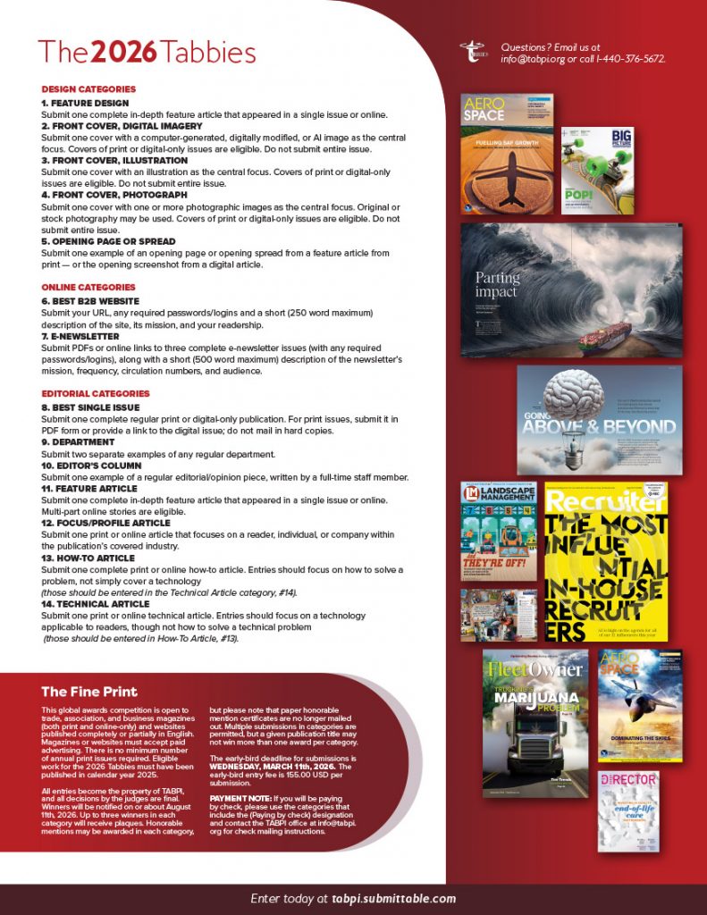 This year’s competition features 14 categories in editorial and design. The Tabbies competition is open to English-language b2b print and online publications. Unlike some more restrictive programs, publications are not required to maintain membership in an organization to participate in the Tabbies — and entry fees remain among the lowest of comparable programs.